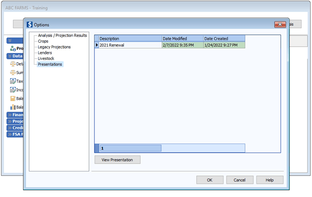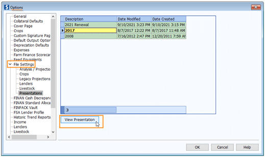 For FINPACK+ users wanting to view legacy presentations, open the Credit Analysis section of a customer file, click on Tools + Options, then click on Presentations. Follow the same process as described here to view, modify, and print a particular legacy presentation.