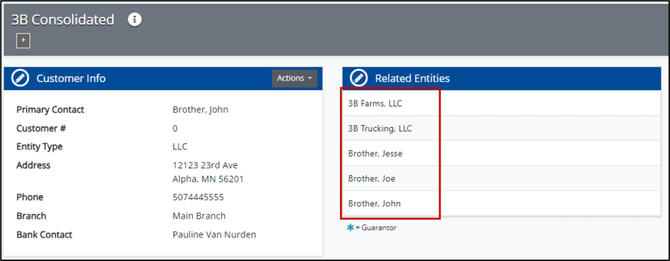 The consolidation process in FINPACK+ begins by identifying the related entities of the global borrower. In this example, our global analysis includes a farming entity, a trucking entity, and three individuals who are owners/guarantors. The related entities are added to the consolidated customer profile by utilizing the pencil icon in the Related Entities dialogue box. Related entities can be edited at any time as changes are warranted for the global borrowing relationship.