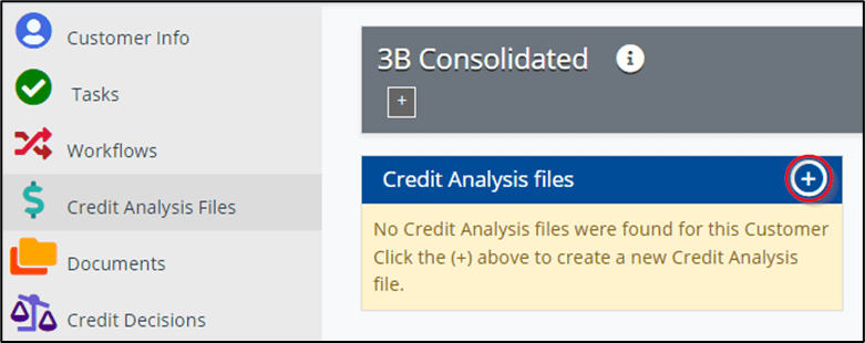 Next, the Credit Analysis file for the consolidated borrower needs to be created. This is the same process as adding a Credit Analysis File to a customer profile.