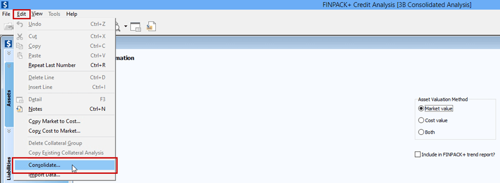 FINPACK Credit Analysis allows users to consolidate the balance sheets or tax forms from several different data files into a consolidated file. For example, a farm or business may have multiple entities for tax reasons, but these entities are controlled by the same owner(s). For analysis purposes, the lender would prefer to consolidate the information for these different entities. (Ex: A farm has an entity that owns the assets, another entity that operates the farm and leases the assets from the first entity, and finally a personal balance sheet. Both are owned by the same person, so consolidating the financial information for both entities provides the best complete financial information for the owner.) A best practice is to consolidate Detailed Balance Sheets or Tax Forms from the different entities into a new Credit Analysis data file, in its own customer profile in FINPACK+. It is recommended to include ‘consolidated’ in the customer profile and related Credit Analysis file name to indicate it is a consolidated file. This consolidated file will be used to underwrite and analyze the global borrower in FINPACK+.