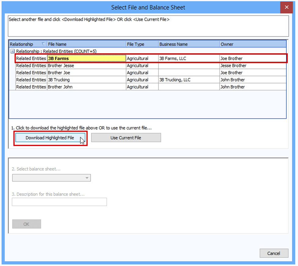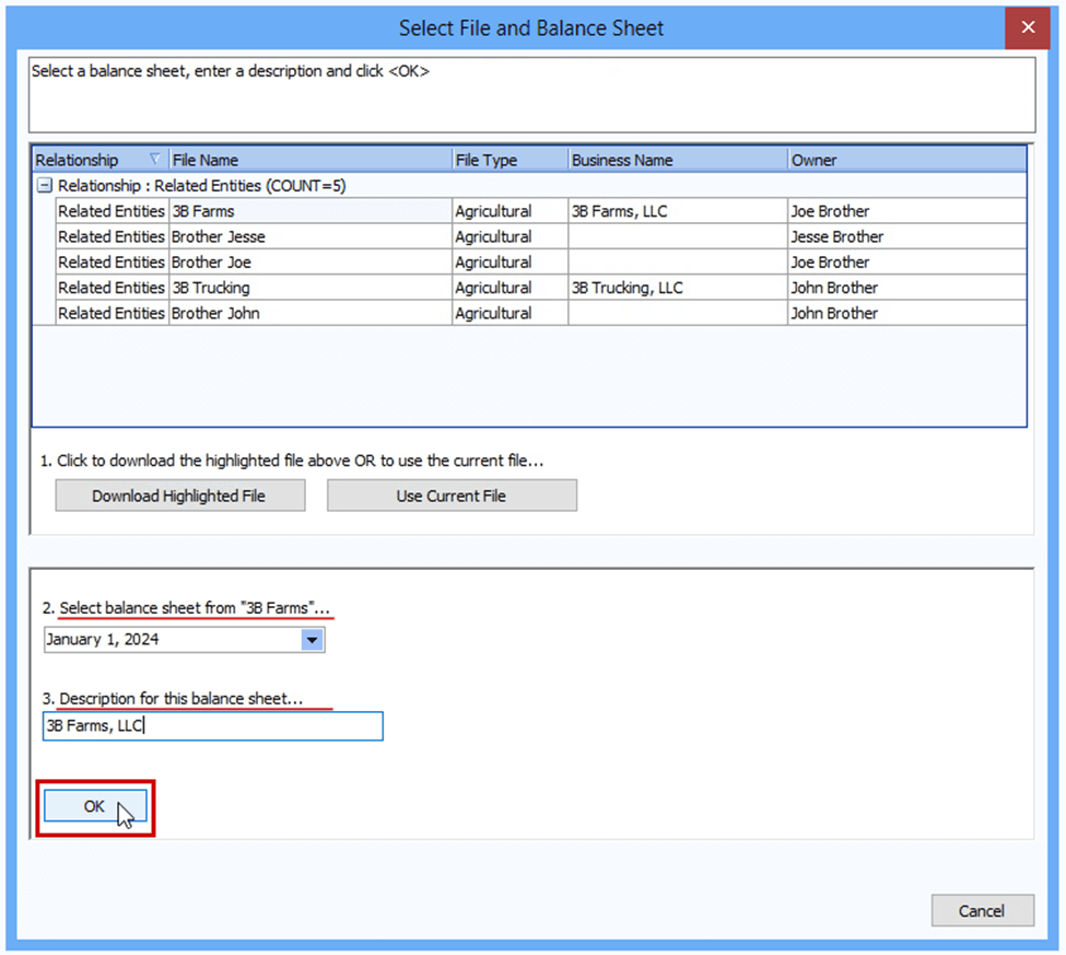 This takes a moment for FINPACK+ to access the selected file. In this example, the Credit Analysis file for 3B Farms, LLC was selected. Once accessed, the appropriate balance sheet is selected from the drop down list in Step 2. and a description is added in Step 3. This short description will be added to indicate the source of assets and liabilities in the consolidated detailed balance sheet. Once these steps are completed, click ‘OK’.