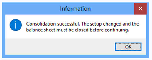 Upon completing the consolidation, a message appears explaining the status of the consolidation. The user is informed of any errors needing attention. The balance sheet must be closed before continuing any additional consolidations or data entry.