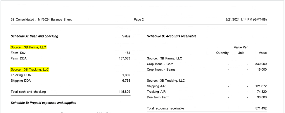 Here is a sample consolidated Detailed Balance Sheet for the 3B Consolidated file. This consolidated file includes 2 entities and 3 individuals: 3B Farms, LLC; 3B Trucking, LLC; and the personal assets of Joe, Jesse, and John Brother.