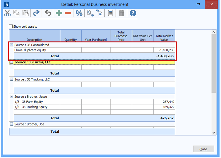 Finally, make any necessary edits or eliminations on the consolidated data. A common item to address is equity entries included on the Detailed Balance Sheets of individuals that are then also contained in the consolidation.