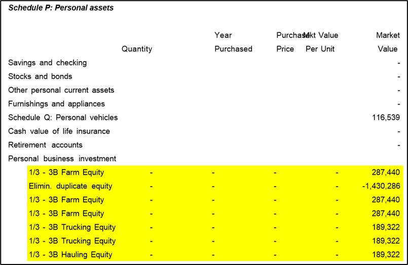 In this example, the individual owners all list 1/3 of the equity of the farm and trucking operations on their personal balance sheet. Therefore, this needs to be edited, or total equity on a consolidated basis will be overstated. In this example, the equity line entries under Personal Business Investment can be deleted. A better practice is to include negative, offsetting entries in the schedule. The example below uses this offsetting approach. The input entry is shown as well as the corresponding detailed balance sheet output.